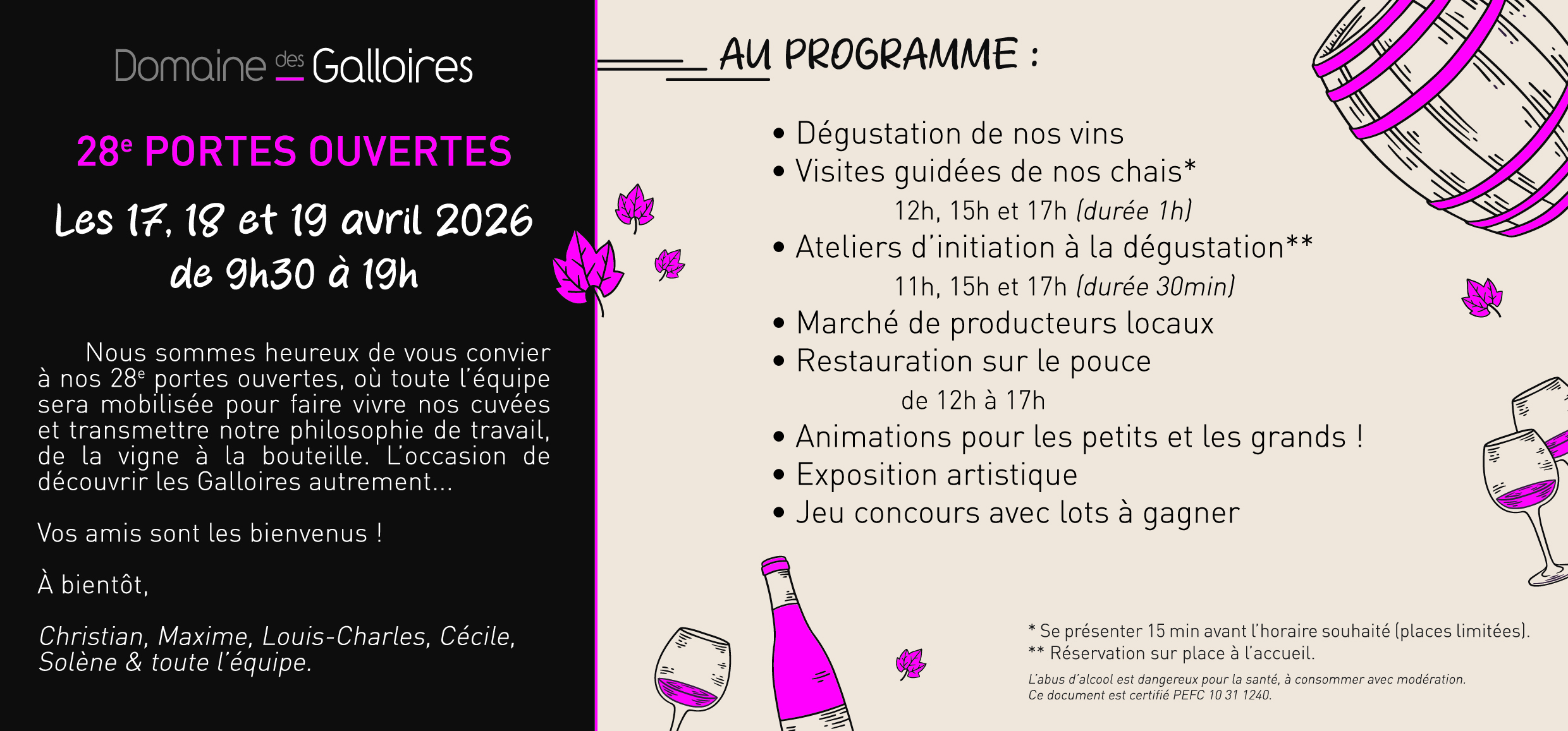 The Domaine des Galloires opens its doors to you for a weekend of events! The whole team will be on hand to bring the vintages to life and pass on their working philosophy, from the vine to the bottle. An opportunity to discover Les Galloires in a different way...