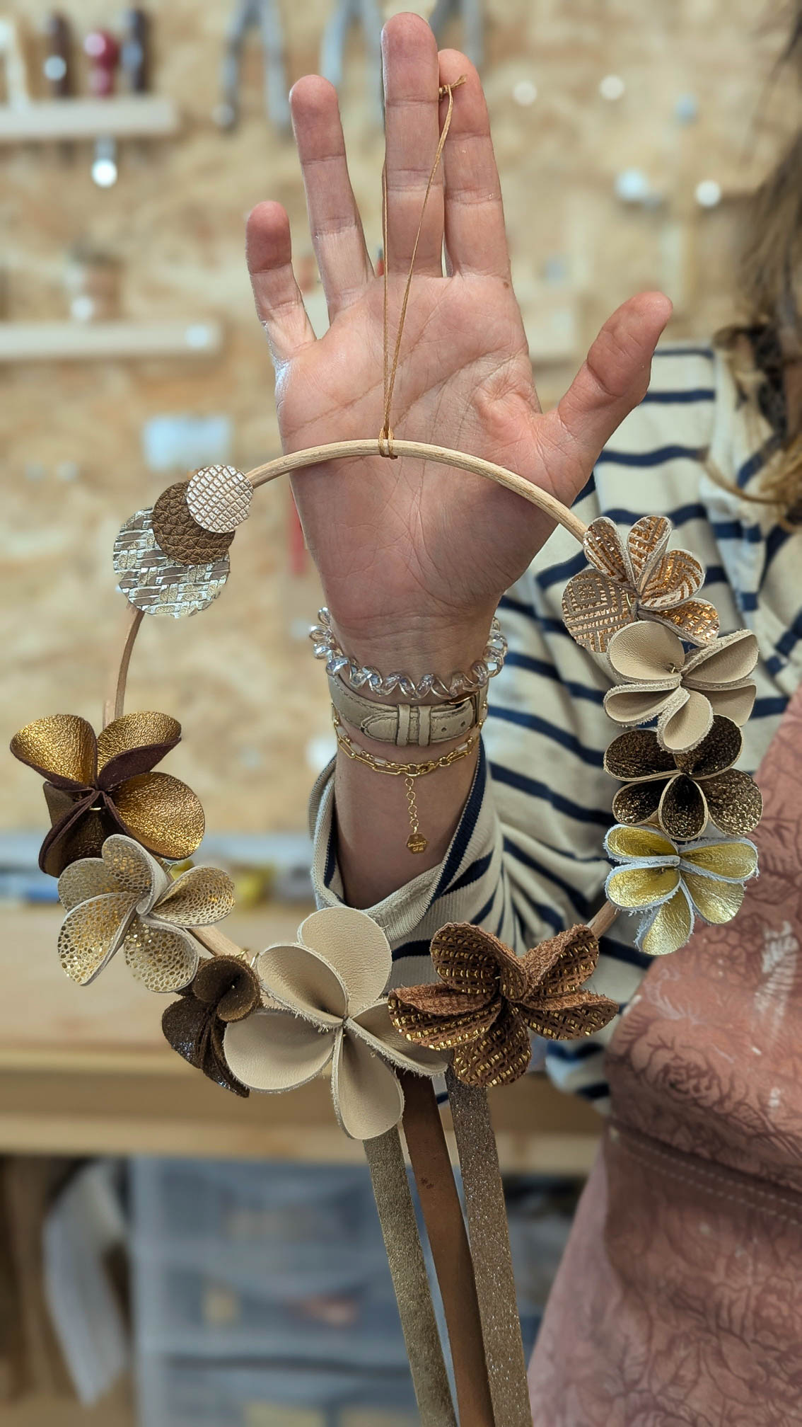 On the programme: Presentation of leathers and tools specific to craft leatherwork. Cutting, shaping and assembling leather flowers; Creating a harmonious composition around a wooden circle. Personalised finishing with leather straps and details of your choice.