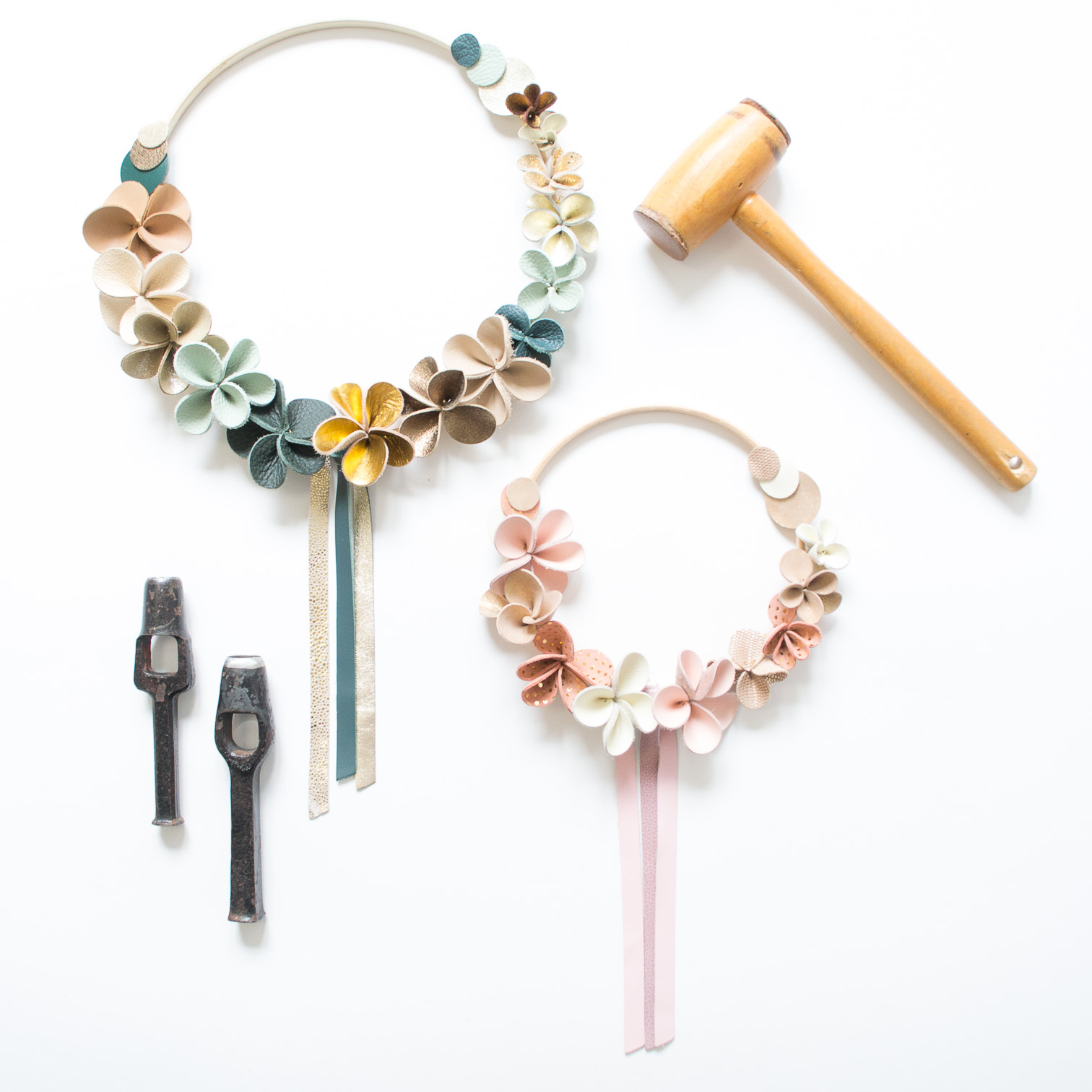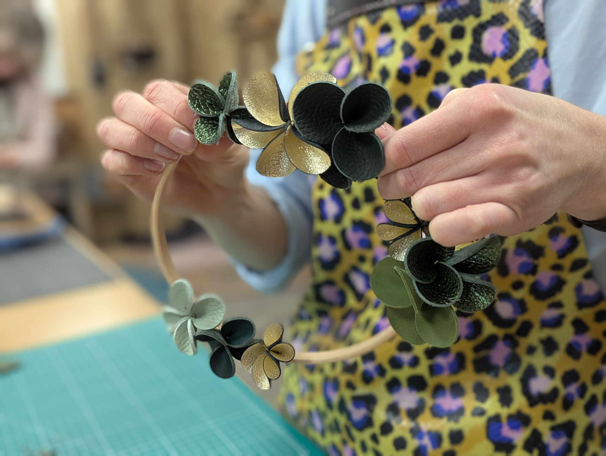Create a colourful, poetic leather wreath in the warm atmosphere of my workshop. During this creative workshop, you'll make a decorative wreath to hang, made from hand-crafted flowers using carefully selected leather scraps.