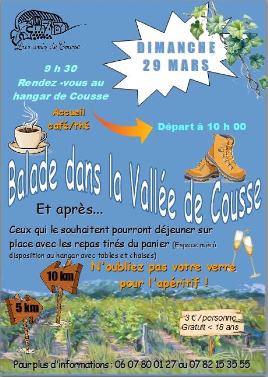 Breadcrumb Home Fêtes et manifestations Balade dans la Vallée de Cousse Useful informations Prices Opening times Services Transports location_onLocate photo_cameraPhotos Useful informations Prices Opening times Services Transports Locate location_on Balade dans la Vallée de Cousse 37210 VERNOU-SUR-BRENNE Full adult price : 3,00 € Period (s) Morning Afternoon Opening day Closing day 29/03/2026 - 29/03/202609:30--- Outdoor events category Join by public transport