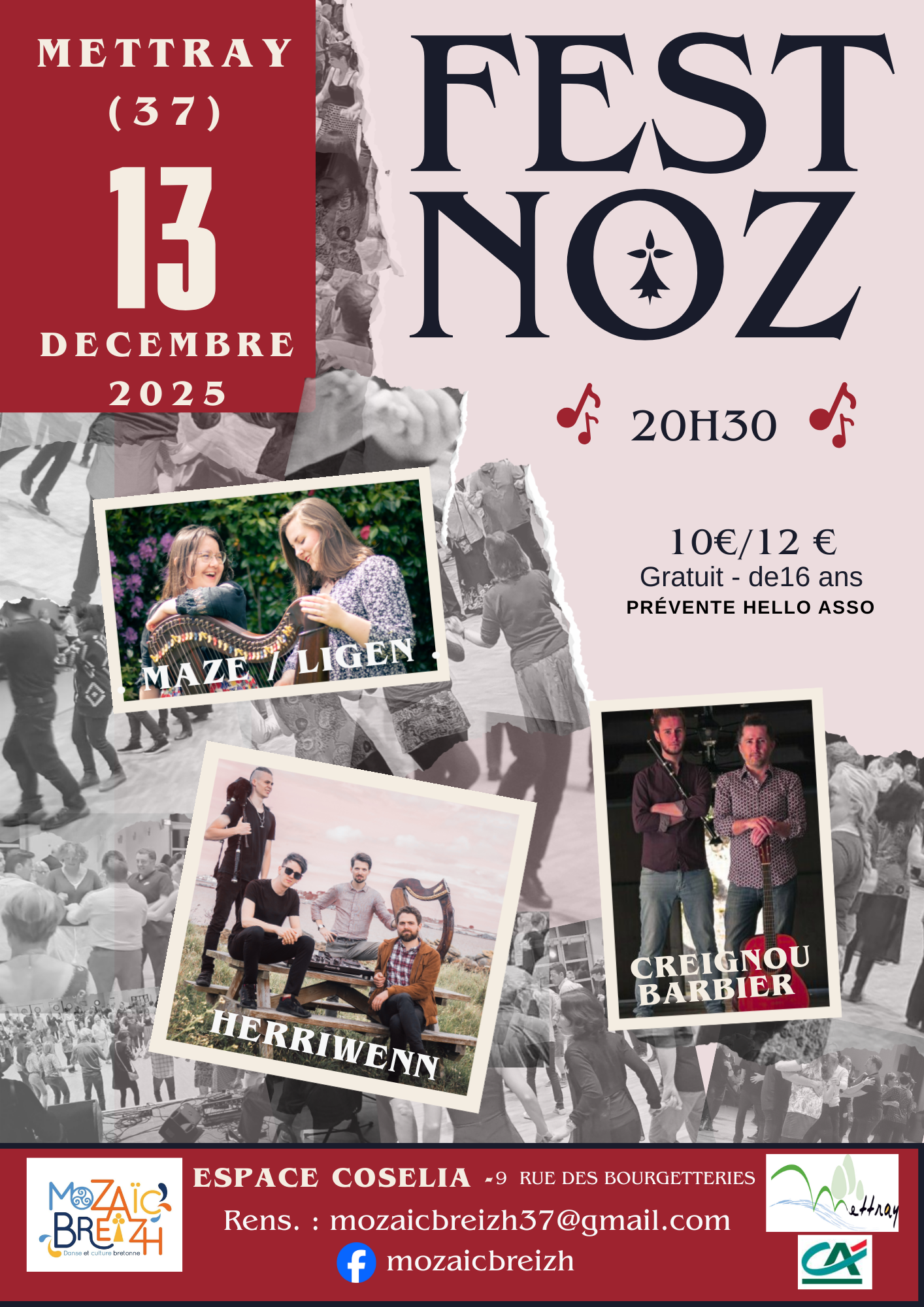 Breadcrumb Home Fêtes et manifestations Fest Noz Useful informations Prices Opening times Services Transports location_onLocate photo_cameraPhotos Useful informations Prices Opening times Services Transports Locate location_on Fest Noz 9 Rue des Bourgetteries 37390 METTRAY location_on Espace Cosélia mail_outline View the mail mail_outline mozaicbreizh37@gmail.com Full adult price : 10,00 € Full adult price : 12,00 € Period (s) Morning Afternoon Opening day Closing day 13/12/2025 - 13/12/2025---- Join by public transport