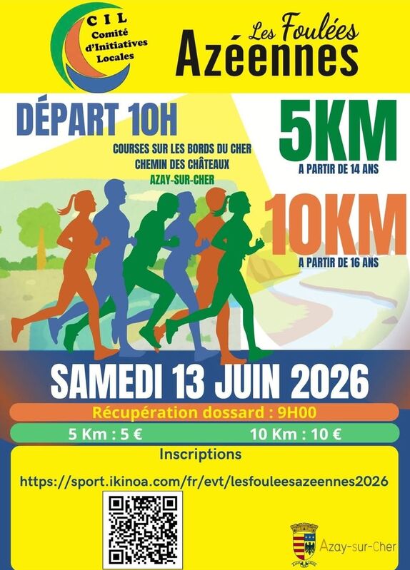 Breadcrumb Home Fêtes et manifestations Les Foulées Azéennes Useful informations Prices Opening times Services Transports location_onLocate photo_cameraPhotos Useful informations Prices Opening times Services Transports Locate location_on Les Foulées Azéennes Chemin des châteaux 37270 AZAY-SUR-CHER mail_outline View the mail mail_outline cil.azaysurcher@gmail.com search Show link search https://sport.ikinoa.com/fr/evt/lesfouleesazeennes2026 Other rates : 5,00 € Other rates : 10,00 € Period (s) Morning Afternoon Opening day Closing day 13/06/2026 - 13/06/202610:00--- Outdoor events category Join by public transport