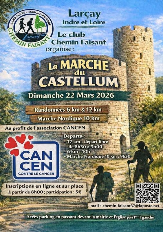 Breadcrumb Home Fêtes et manifestations Marche du Castellum Useful informations Prices Opening times Services Transports location_onLocate photo_cameraPhotos Useful informations Prices Opening times Services Transports Locate location_on Marche du Castellum 3 Rue du 8 Mai 37270 LARCAY mail_outline View the mail mail_outline chemin.faisant37@laposte.net search Show link search https://www.helloasso.com/associations/chemin-faisant-larcay-37/evenements/inscription-marche-du-castellum-2026 Period (s) Morning Afternoon Opening day Closing day 22/03/2026 - 22/03/202608:0013:00-- Outdoor events category Join by public transport
