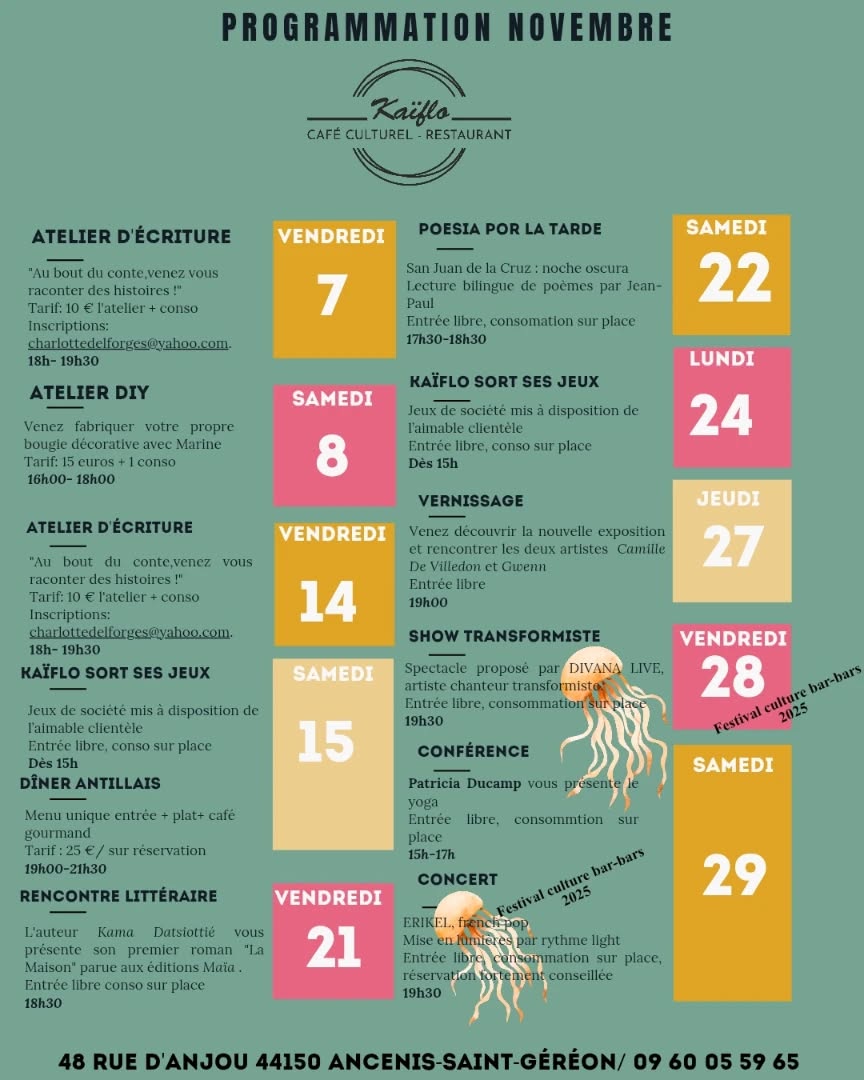 Breadcrumb Home Fêtes et manifestations Show transformiste – Kaïflo Useful informations Prices Opening times Services Transports location_onLocate photo_cameraPhotos Useful informations Prices Opening times Services Transports Locate Free admission Drinks on site location_on Show transformiste – Kaïflo Café culturel Restaurant Kaïflo 48 Rue d'Anjou 44150 ANCENIS-SAINT-GEREON smartphone Show number smartphone 09 60 05 59 65 mail_outline View the mail mail_outline kaiflo.ancenis@gmail.com search Show link search https://www.kaiflo-ancenis.com/ Period (s) Start End Opening day Closing day 28/11/2025 - 28/11/202519:30--- Join by public transport