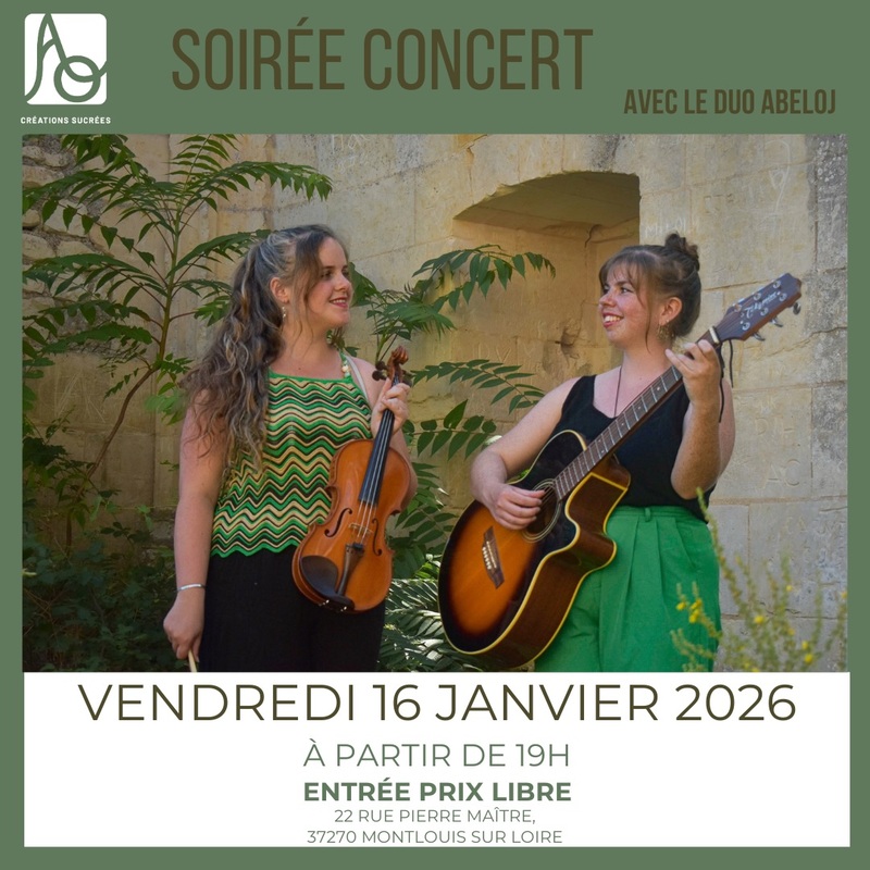 Breadcrumb Home Fêtes et manifestations Soirée concert A.O Créations sucrées Useful informations Prices Opening times Services Transports location_onLocate photo_cameraPhotos Useful informations Prices Opening times Services Transports Locate location_on Soirée concert A.O Créations sucrées 22 Rue Pierre Maître 37270 MONTLOUIS-SUR-LOIRE mail_outline View the mail mail_outline ao.creationssucrees@gmail.com search Show link search https://ao-creations-sucrees.eatbu.com Period (s) Morning Afternoon Opening day Closing day 16/01/2026 - 16/01/202619:00--- Join by public transport