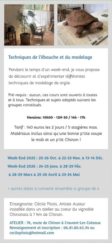 Breadcrumb Home Fêtes et manifestations Stages de sculpture Useful informations Prices Opening times Services Transports location_onLocate photo_cameraPhotos Useful informations Prices Opening times Services Transports Locate location_on Stages de sculpture 76 Route de Chinon 37500 CRAVANT-LES-COTEAUX location_on 76, route de Chinon à Cravant-les-Coteaux Period (s) Morning Afternoon Opening day Closing day 22/11/2025 - 23/11/2025---- Join by public transport