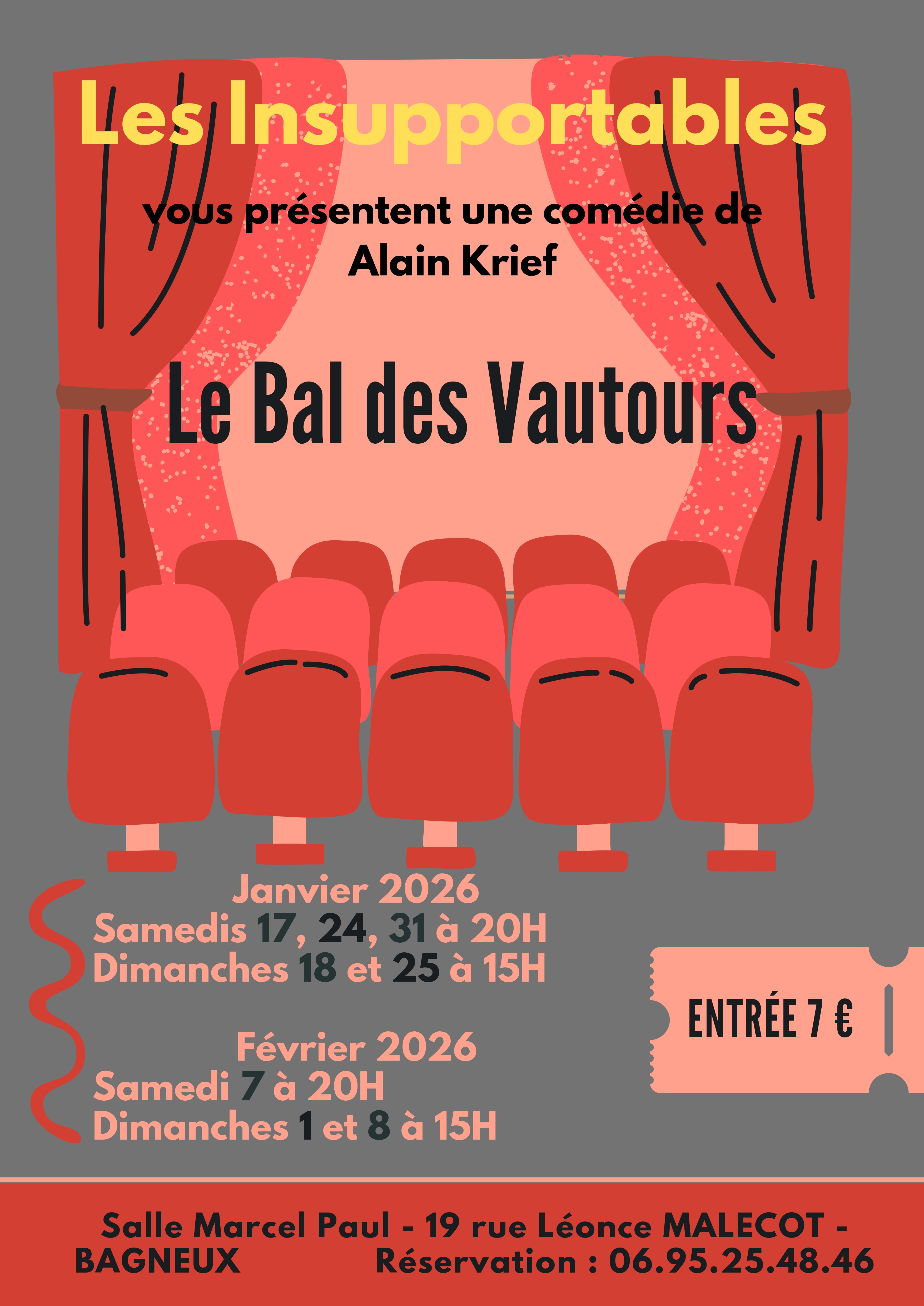 Breadcrumb Home Fêtes et manifestations Théâtre – Le bal des vautours Useful informations Prices Opening times Services Transports location_onLocate photo_cameraPhotos Useful informations Prices Opening times Services Transports Locate location_on Théâtre – Le bal des vautours 19 rue Léonce Malécot Bagneux 49400 SAUMUR smartphone Show number smartphone 06 95 25 48 46 mail_outline View the mail mail_outline insus49@gmail.com Means of paymentCheques and postal orders Period (s) Start End Opening day Closing day 25/01/2026 - 25/01/202615:0018:00-- Join by public transport